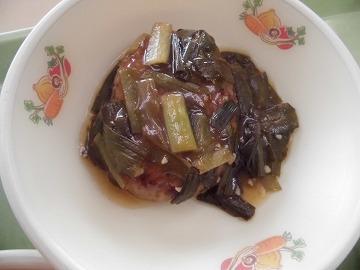 ハンバーグにらソースがけ…鹿沼市特産のにらを使っています。