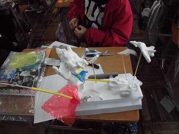 児童それぞれの願いが種から芽が出てきて叶うというイメージで、立体物を創作していました。