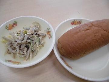 今日は、冬が旬のごぼうのサラダです。ごぼうは、おなかのなかをきれいにしてくれる食物繊維という栄養がたくさんはいっています。また、今日の黒パンは、黒砂糖が入っています。カルシウムなどの栄養がたくさん含まれています。よくかんで食べると、黒砂糖のうまみや甘みが感じられておいしいパンです。