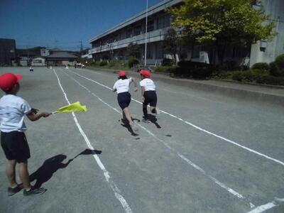 4年生の体育の授業です。体力テストに向け、50メートル走のスタートの練習です。