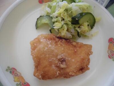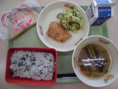 わかめごはん 牛乳 鶏のから揚げ 即席漬け お祝い吉野汁 お祝いクレープ
