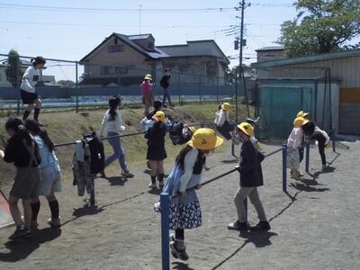 たくさんの場所で、1年生と遊んだり、見守ったりする上級生がいました。