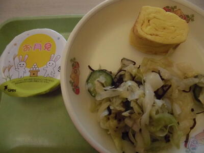 わかめごはん 牛乳 塩昆布和え 卵焼き 里芋のそぼろ煮 お月見ゼリー
