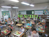 4年1組の様子です。ジャージャン豆腐とギョーザの組み合わせがよく、残さず食べていました。また、昨日に引き続き、KLVの方による読み聞かせがありました。「まめたろう」の後半部分を読んでいただきました。