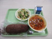 本日の献立は、食パン、クリーム、チリコンカン、スパゲティサラダ、牛乳でした。