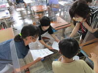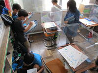 〇 6年1組 算数 線対象や点対称を使って、図形を描いていました。自力解決解決後、仲間同士で教え合って、正解を求めていました。