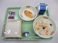 5年1組の給食の様子です。クラムチャウダーのスープは、ちょうどよい温かさで美味しかったです。