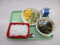 本日のメニュー:【塩(エン)ジョイランチ】(ご飯、納豆、おかか和え、ジャガイモのピリ辛煮、牛乳)でした。「おいしく!楽しく!減塩しよう!」という給食です。小学校は、1回の給食で、2.0gより少ないほうがよいされいて、今日は、いつもより少ない塩の量となっています。