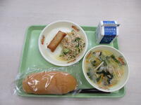 本日の献立:ミルクパン、牛乳、はるまき、バンバンジーサラダ、タイピーエンでした。たっぷりの野菜と春雨を入れたスープがタイピーエンです。春雨は、熱や力の素になるはたらきがあります。