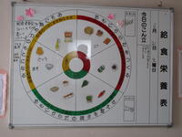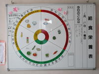16日木曜日の献立:ご飯、牛乳、モロカツのみそソースかけ、ニラともやしのおかか和え、ざくざく汁(6年1組の様子)