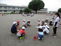 今回は、「1年生と仲良くなろう」をテーマに、校庭で1班10人、45班に分かれて行いました。感染対策をとりながらの取り組みでした。曇り空でしたが、過ごしやすい天気でした。