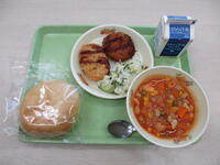 6月29日水曜日(3年1組):【セレクト給食】まるパン、メンチカツ・えびカツ、コールスロー、チキンビーンズ。