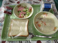 金曜日;スラッピージョー(コッペパン)、牛乳、ミートソース、フライドポテト、野菜スープ
