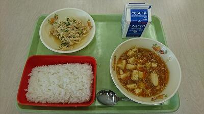 今日の献立は、ご飯、麻婆豆腐、棒棒鶏サラダ、牛乳でした。