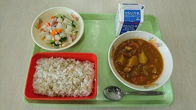 今日の献立は、大麦ご飯、チキンカレー、カリコリサラダ、牛乳でした。