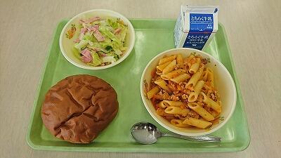 今日の献立は、黒丸パン、ペンネボロネーゼ、ハムマリネサラダ、牛乳でした。