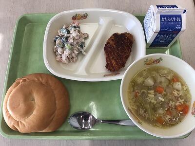 今日の献立は、バターロール、白身魚フライ、ツナと大豆のサラダ、野菜コンソメスープ、牛乳でした。