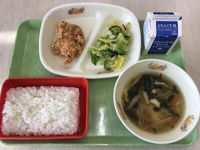 今日の献立は、塩(エン)ジョイランチで、ご飯、鶏の唐揚げ、塩昆布和え、田舎汁、牛乳でした。