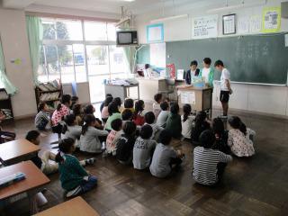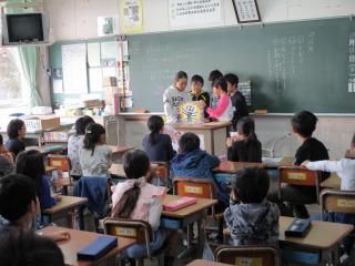 今朝の「朝の活動の時間」に、5、6年生の児童が低学年の子供たちに紙芝居の読み聞かせを行いました。