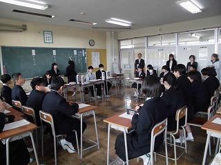 本日は、中1の2授業実施され、どちらも本校卒業生が、司会者等の役割を果たしたり、鋭い意見を発表をするなど大活躍でした。授業に臨む姿勢もすばらしく、目がキラキラしていました。すごい発言に、参観者も「おー」って言ってしまう意見も多くありました。意見が異なったときの意見の聞き方、伝え方、折り合いの付け方など、成長した姿を見せてくださいました。