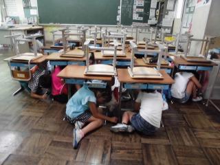 今日は、今年度2回目の避難訓練でした。業間を使い、竜巻が南の方から学校に接近してきたことを想定して、教室内で身を守る動作の訓練をしました。