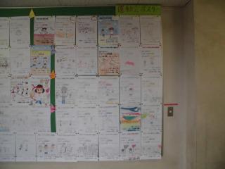 昇降口近くの廊下には、応募作品がたくさん掲示され、行き交う子供たちが見入っています。