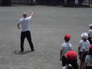 【3年2組】ALTのティム先生がソフトボール投げの見本を見せてくれました