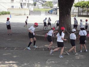 4年1組の体育でしたが、大欅の日陰を有効に利用して、体育の授業を実施していました。ラダーを使用して、リズムよくさまざまなステップを踏む練習です。