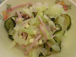 今日は、豆腐サラダです。豆腐は、野菜の上にのせ、その上にドレッシングをかけて食べます。豆腐は、大豆からできた豆乳を固めてつくられます。大豆と同じようにたんぱく質を多く含み、栄養豊富な食品です。