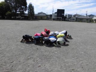 校庭で身を寄せ合って低い姿勢を取ったり           机の下に身を隠したり