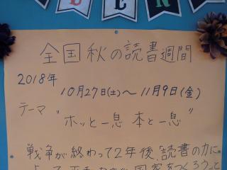 図書室前の掲示板に目をやると、今月末から始まる「全国秋の読書週間」に関する図書委員会作成の掲示物があります。今年のテーマは『ホッと一息、本と一息』です。