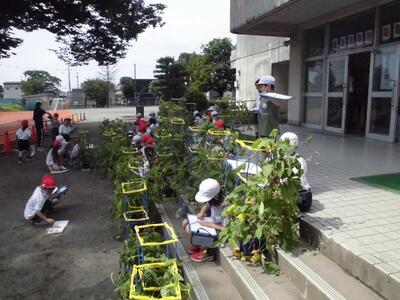 今日は1組でアサガオの観察をしました。アサガオのつるが隣の人のアサガオとからまって、写真のような状況で観察をするまでに時間がかかってしまいました。