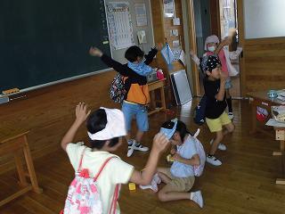 動作化をしているうちに「おむすびころりんすっとんとん ころころころりんすっとんとん」の歌に、本当に楽しくなって踊り出す1年生おじいさん達。