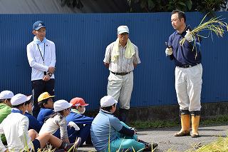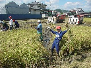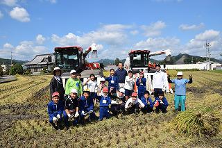 さわやかな秋晴れの下、5月に植えた稲の刈り取りをしました。