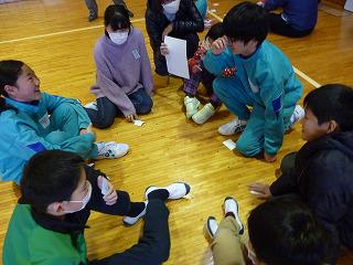 最後に体育館で中学校1年生や他の小学校の6年生と仲間づくりゲームをしました。緊張がほぐれ、4月から一緒に生活できるような雰囲気ができました。