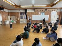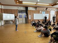 中学1年生から中学校の生活や学習、部活動などについてクイズ形式で教えてもらいました。続いて中学1年数学と英語生の授業を参観し、その後、体育館で中学1年生と6年生が10のグループに分かれゲームで楽しく交流しました。