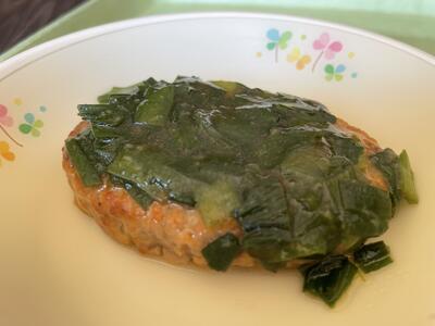 献立は、さつきの舞米粉パン、牛乳、はと麦ぞうすい、ハンバーグにらソースかけ、県産とちおとめヨーグルトです。