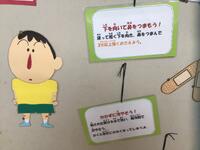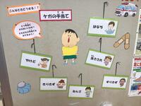 保健室前廊下の掲示です。救急の日(9月9日)にちなんだ掲示がされています。カードをめくるとケガの治療や応急処置の仕方が書いてあります。
