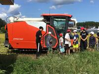 5・6年生が総合的な学習で、コンバインで稲刈りをする作業を見学させていただきました。学校の近くの田で刈り取りの作業をしてくださいましたので、とてもありがたく思います。