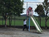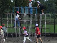 業者の方3名で校庭の、ブランコ、ジャングルジム、滑り台、鉄棒、雲梯、登り棒等を点検していただきました。毎月初めには職員が、組になっての安全点検を行なっていますが、プロの目で細部にわたる点検はありがたい限りです。