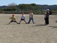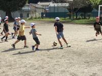 今日は、風が心地よくとても良い天気です。今日のロングのびのびでは、校庭で2つの班ずつに分かれて対戦型ゲーム遊びをしました。