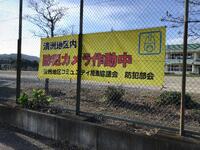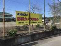 先日、清洲コミュニティ・センター所長と職員の方で来校し、校庭南側のフェンスに横断幕を設置してくださいました。この度、清洲地区コミュニティ推進協議会の防犯部会で協議して学校に設置する運びとなったそうです。学校以外にも幾つかの場所に看板等は設置されているようですが、このように大きな横断幕は初めてだそうです。