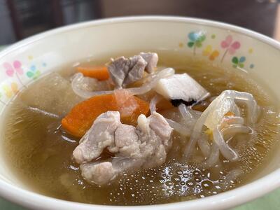 献立は、セルフジャンバラヤ(ごはん、ジャンバラヤの具)、牛乳、コールスロー、ヌードルスープです。