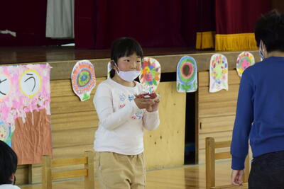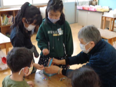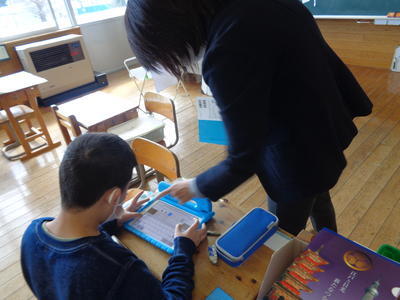1月15日(金)の3時間目に、1、2年生の生活の時間に、地域のお年寄りの方に来ていただき、昔の遊びを教えていただきました。こまとお手玉とおはじきです。最初は、なかなかできなかった子が多くいましたが、やっているうちにできるよになり、とても楽しそうに取り組んでいました。3名の皆さまありがとうございました。