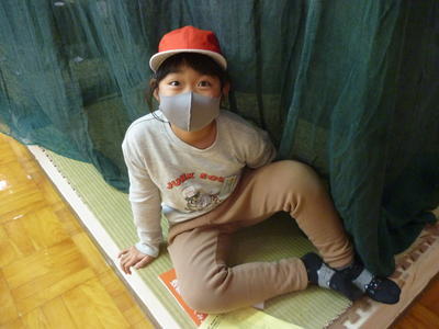 蚊帳の中に入り、昔の子供気分を味わいました。