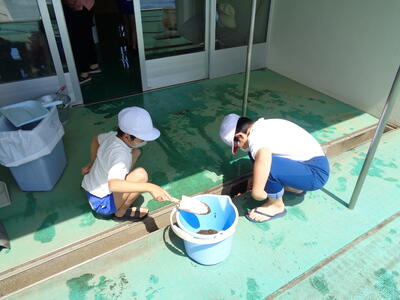 プールサイド、更衣室やトイレ、ベンチなどを水で流しながらデッキブラシやたわしで一生懸命にこすって汚れを落としました。日差しが強く気温が高かったので、早めに教室に戻る下学年の子たちに「ありがとうねー」と声をかける上学年の子たちの心の中に、学校の中心として頑張っている気持ちが育ってきていることを感じました。