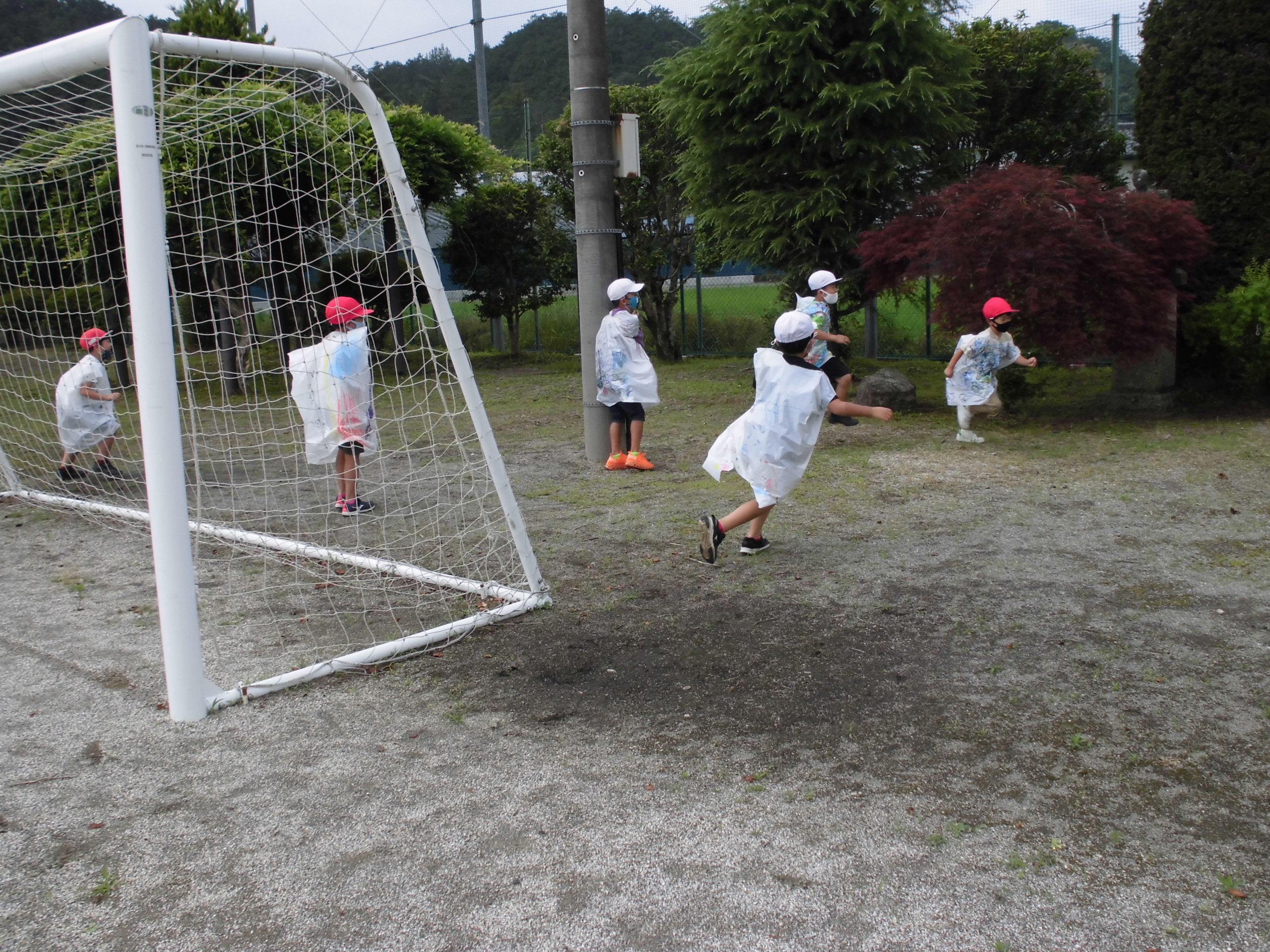 1,2年生の生活科の授業で、レインコートを作りました。今日は、雨は降っていなかったのですが、みんなで着て外で虫を探したり、鬼ごっこをしたりしました。お家でも着てみてね!