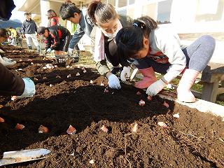 12月1日(日)には、児童、保護者、中学生、地域の方がたくさん来てくださり球根植えをしました。交通指導員の葛西さんが、ボランティアとして、時間を見つけては花壇の枯れた草花や雑草を抜いてきれいにしてくださっていたお陰で、大変スムーズに作業を進めることができ、約1時間で600個の球根を植えることができました。