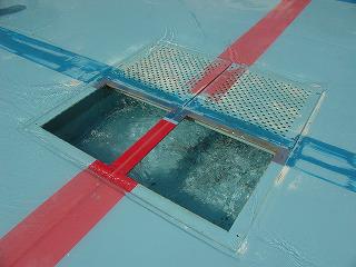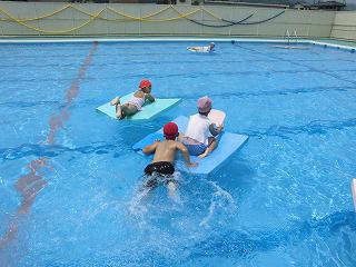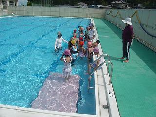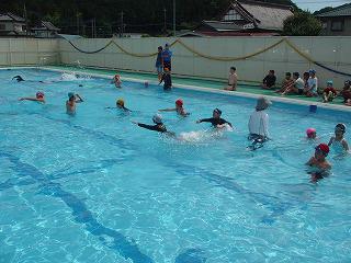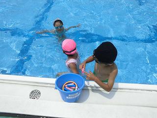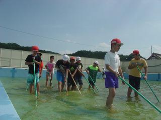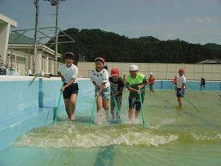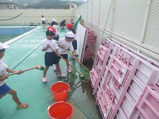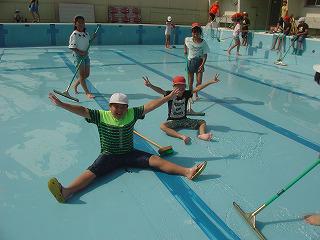 最初に全員でプールの壁の汚れを落とします 一年生もプールサイドをゴシゴシ