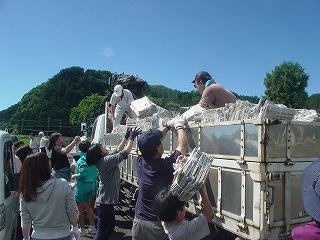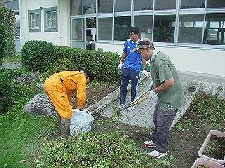 昨日は校舎裏の外水道の水が出たのに、この日の朝になって粟野の水がめが枯渇してしまい断水してしまったのには参りました。しかし、プールの水をバケツリレーして校内に運びこみ、教室や廊下、体育館の床や泥まみれになった物品の拭きだしをしました。加えてスコップで校舎周辺の泥出しもしてもらいました。